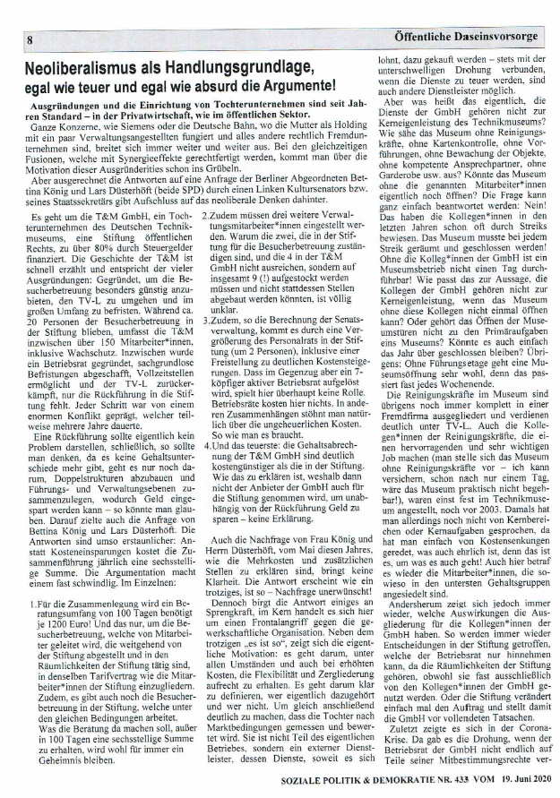 Im Text genannte Antworten der Kulturverwaltung auf Anfragen der Genoss*innen König und Düsterhöft: Gleicher Lohn für gleiche Arbeit im Technikmuseum – und dennoch getrennt vereint?Technikmuseum – aus zwei mach eins, Rückführung der T&M GmbH jetzt! Share this ArticlePrevious Article„Ein Krankenhaus – Eine Belegschaft! Gegen den Ausgliederungswahn!“Next ArticleAfA-Antrag vom Kreisvorstand angenommenBertram Related Posts Adventskaffee im Bürgerbüro mit Krippenausstellung 28. November 2025 Queerer Filmabend im Bürgerbüro 28. November 2025 Ausbildungsplatzumlage: Diskussion ehrlich und sachlich führen! 28. November 2025 Hinterlasse einen Kommentar Antwort abbrechenDeine E-Mail-Adresse wird nicht veröffentlicht. Erforderliche Felder sind mit * markiertKommentarName * E-Mail * Website